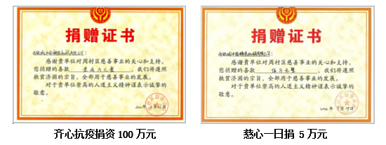 2022年3月,周村疫情嚴峻,企業快速作出反應,齊心抗疫,第一時間向周村慈善總會捐款 100 萬元,體現企業的責任和擔當。疫情期間,公司各級領導員工同吃同住在公司,保證大家的生活和公司運營,為奪取疫情防控和實現社會責任發展雙勝利做出了不可磨滅的貢獻。