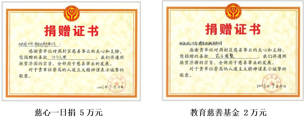 2023年7月份慈心一日捐,公司捐款5萬(wàn)元,同年9月份再捐款2萬(wàn)元教育慈善基金,共計(jì)捐贈(zèng)7萬(wàn)元。提升奉獻(xiàn)意識(shí),弘揚(yáng)社會(huì)正能量,營(yíng)造了“人人關(guān)心慈善、人人支持慈善、人人參與慈善”的良好氛圍。獲得了當(dāng)?shù)卣亩啻魏迷u(píng),并榮獲“尊師重教先進(jìn)單位”榮譽(yù)稱號(hào)。